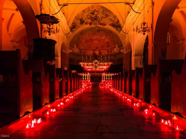 À l’intérieur, l’ambiance se fait plus intime. Un jeu de lumières vacillantes, créé par une installation soignée de bougies, enveloppe l’atmosphère d’une chaleur douce et apaisante. L’espace sacré devient lieu de recueillement, où chaque détail est mis en valeur par la lumière.